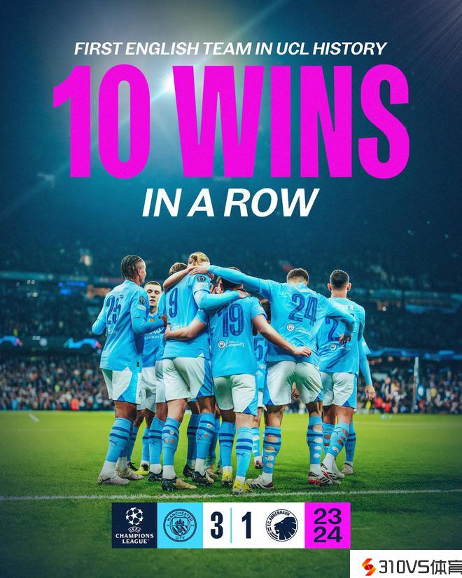 豪取10连胜,曼城创英格兰球队欧冠最长连胜纪录