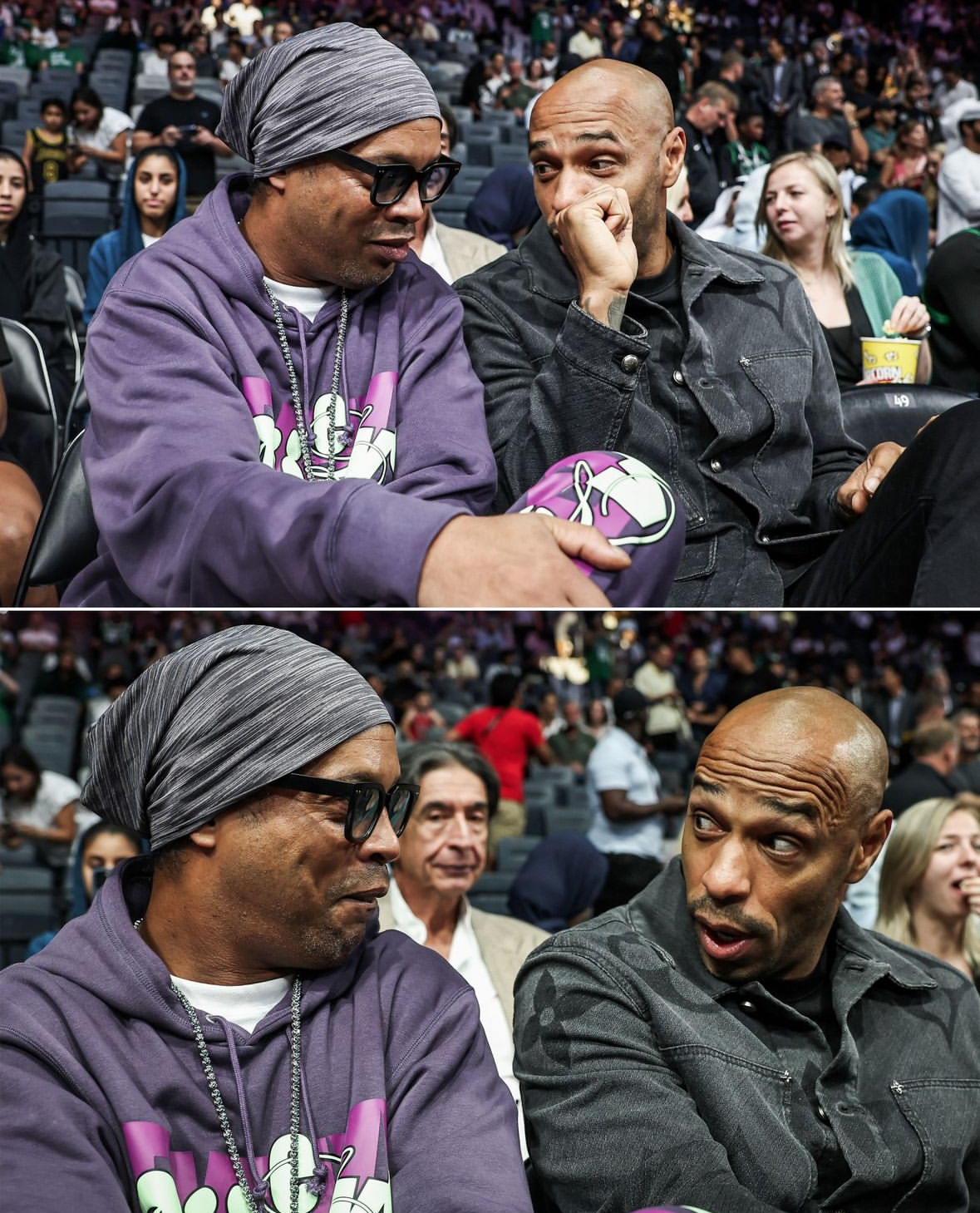 罗纳尔迪尼奥与亨利一起观看了掘金对阵凯尔特人的比赛! 猜猜看他们是哪方的球迷!?