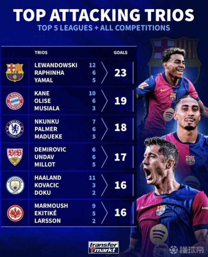最近,德国转会市场列出了五大联赛各队进攻三人组的进球数,并列出榜单,巴萨三叉戟打进23球居首,拜仁三叉戟打进19球位列次席。