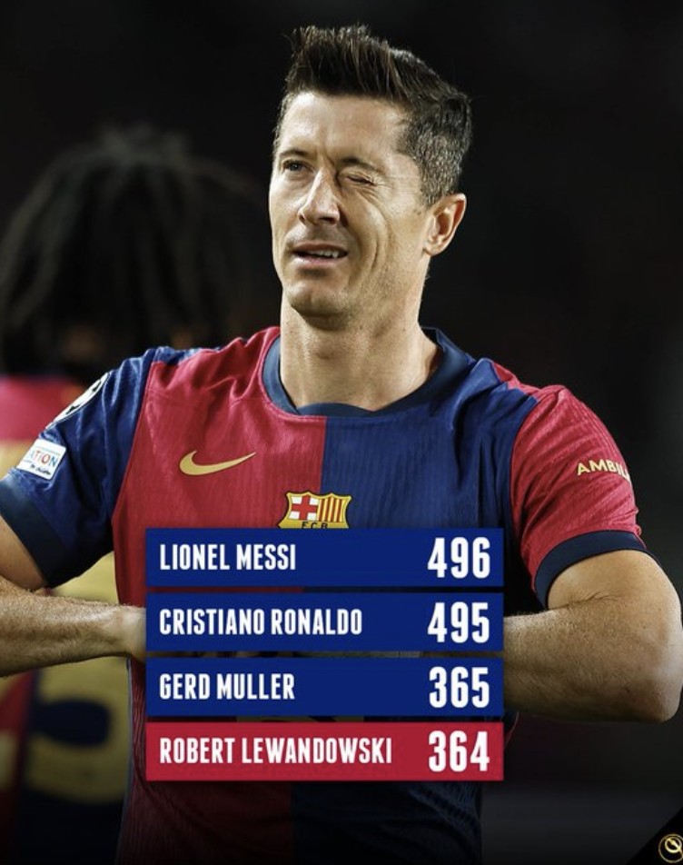 莱万364球排在五大联赛历史射手榜第4位,差1球追平盖德-穆勒