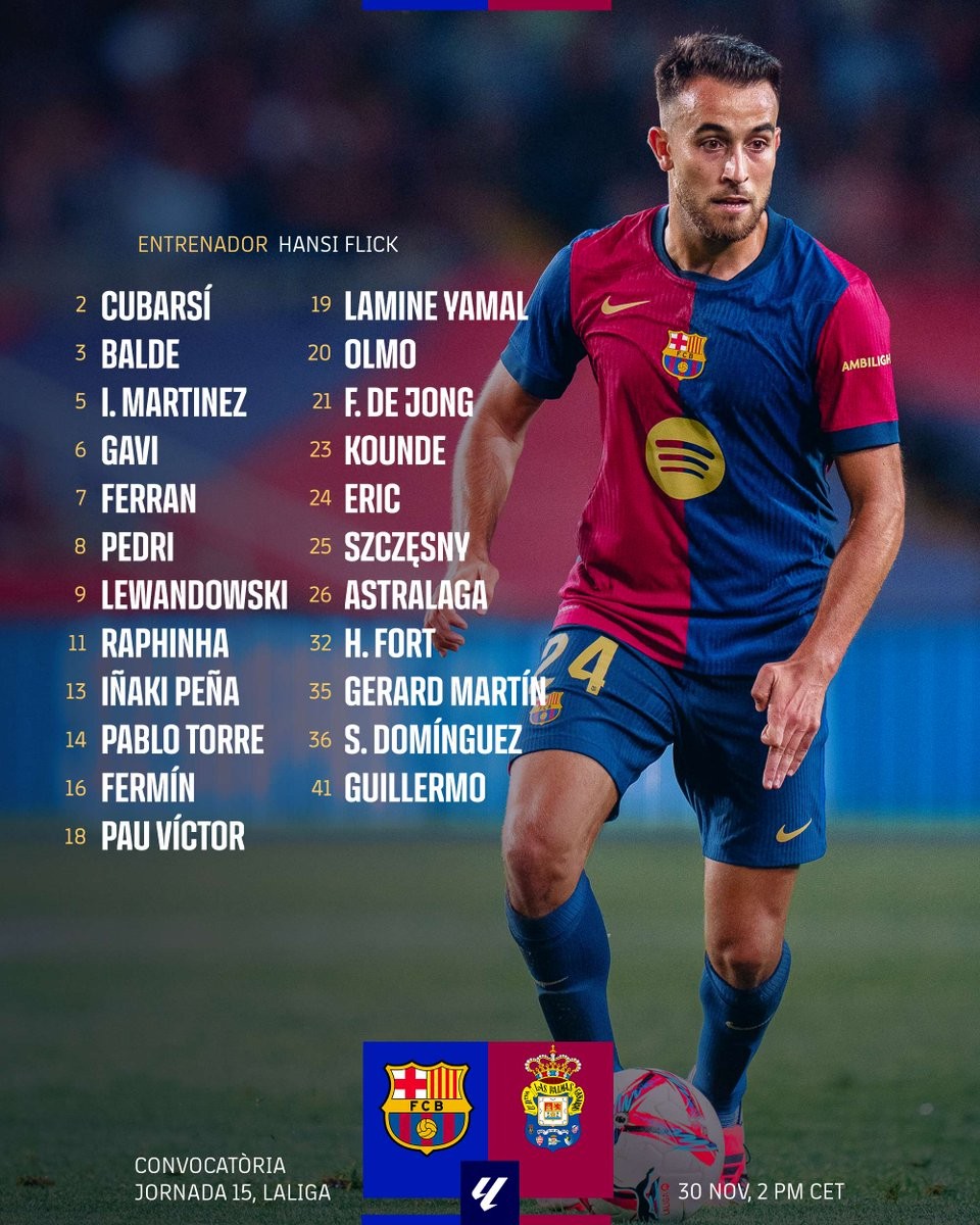 巴塞罗那官方公布了西甲第15轮主场对阵拉斯帕尔马斯的比赛大名单,莱万领衔,亚马尔、费兰-托雷斯伤愈回归,比赛将于北京时间11月30日21:00进行。
