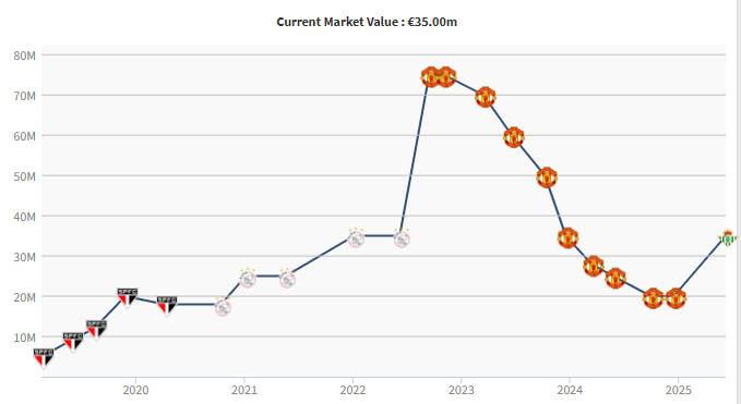 在今年冬窗租借加盟贝蒂斯后,安东尼给出了出色的表现,在2025年6月的最新身价统计中,他的身价上涨到了3500万欧元。