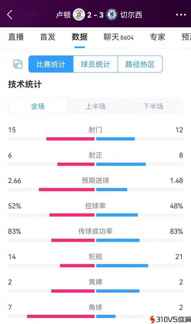 切尔西3-2卢顿全场数据:射门12-15,射正8-6,预期进球1.48-2.66