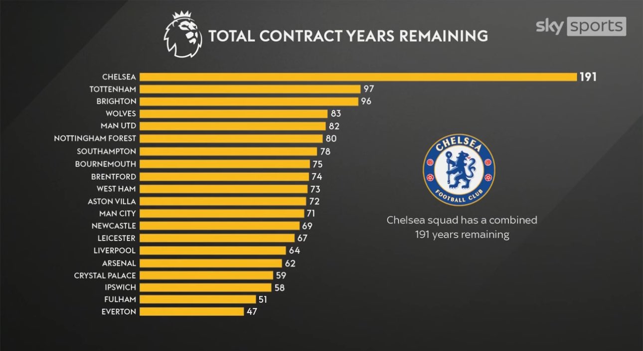 天空体育:切尔西一线队合同总年数合计191年 平均每人4.11年 位居世界59大联赛榜首