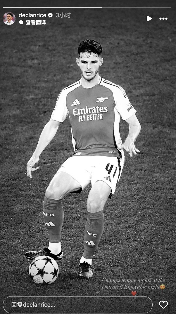 赖斯社媒晒比赛照,配文:在酋长球场的欧冠之夜,值得享受