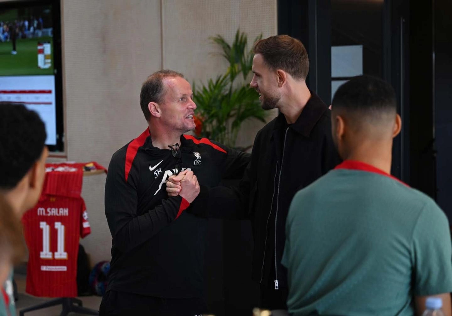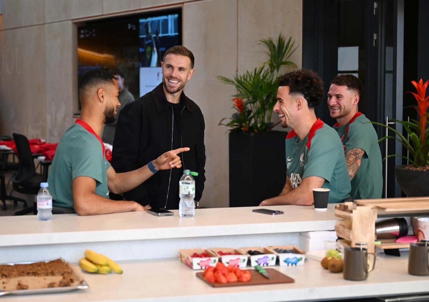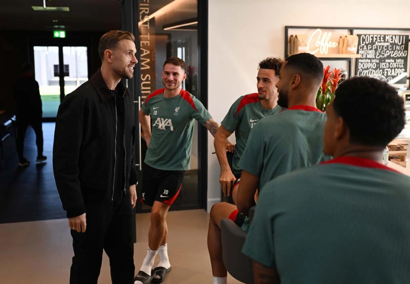 利物浦官方晒照,亨德森在本周造访俱乐部训练基地,受到了他的前队友和现任教练组成员的热烈欢迎。
