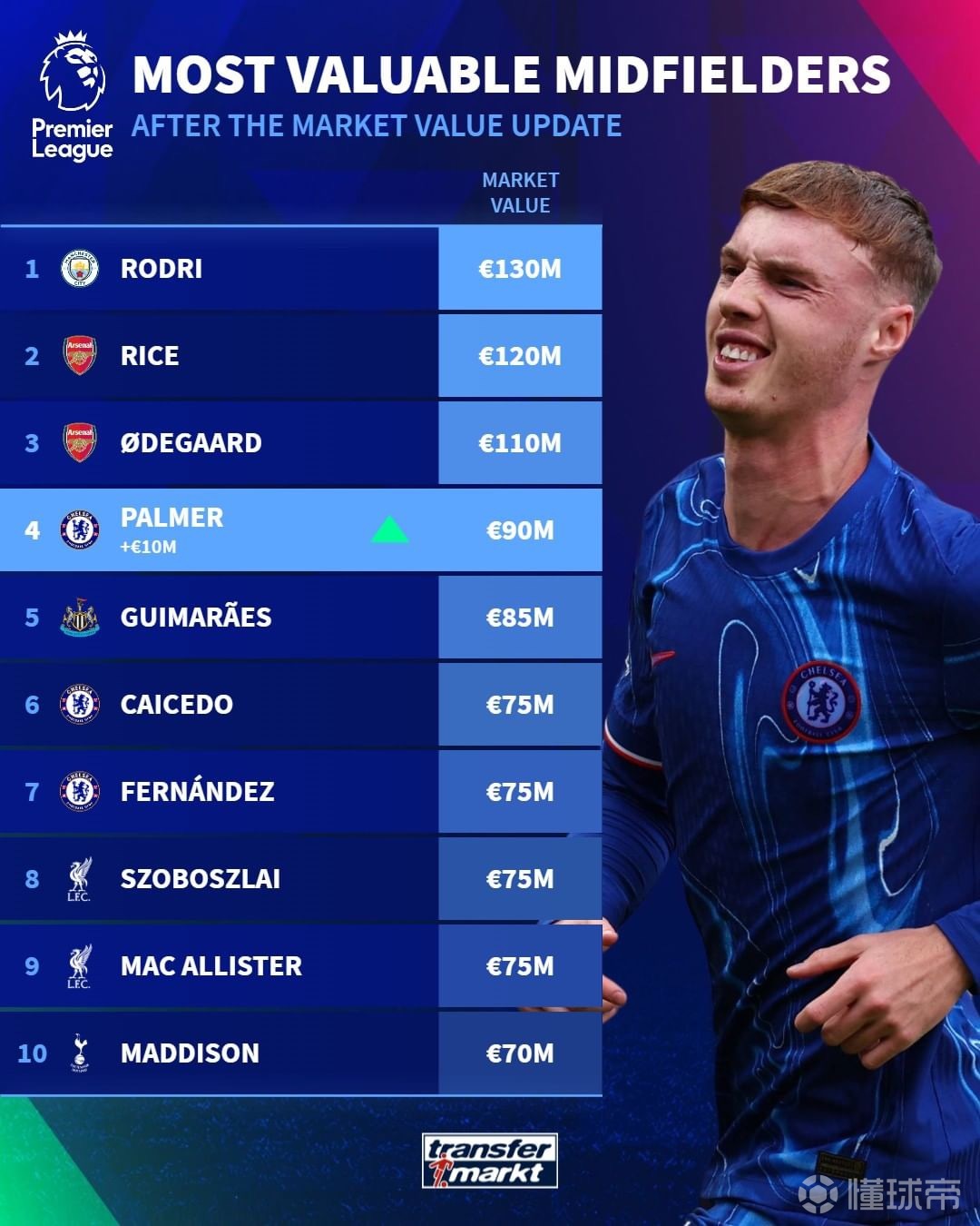 身价更新之后英超中场球员身价排行榜:
