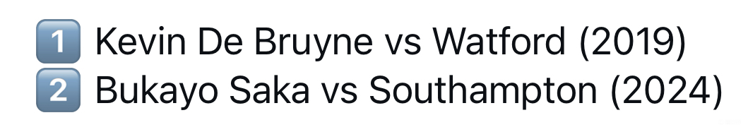 过去十年,只有两位球员做到同一场比赛参与3+个进球和创造4+次重大机会! 德布劳内和萨卡!