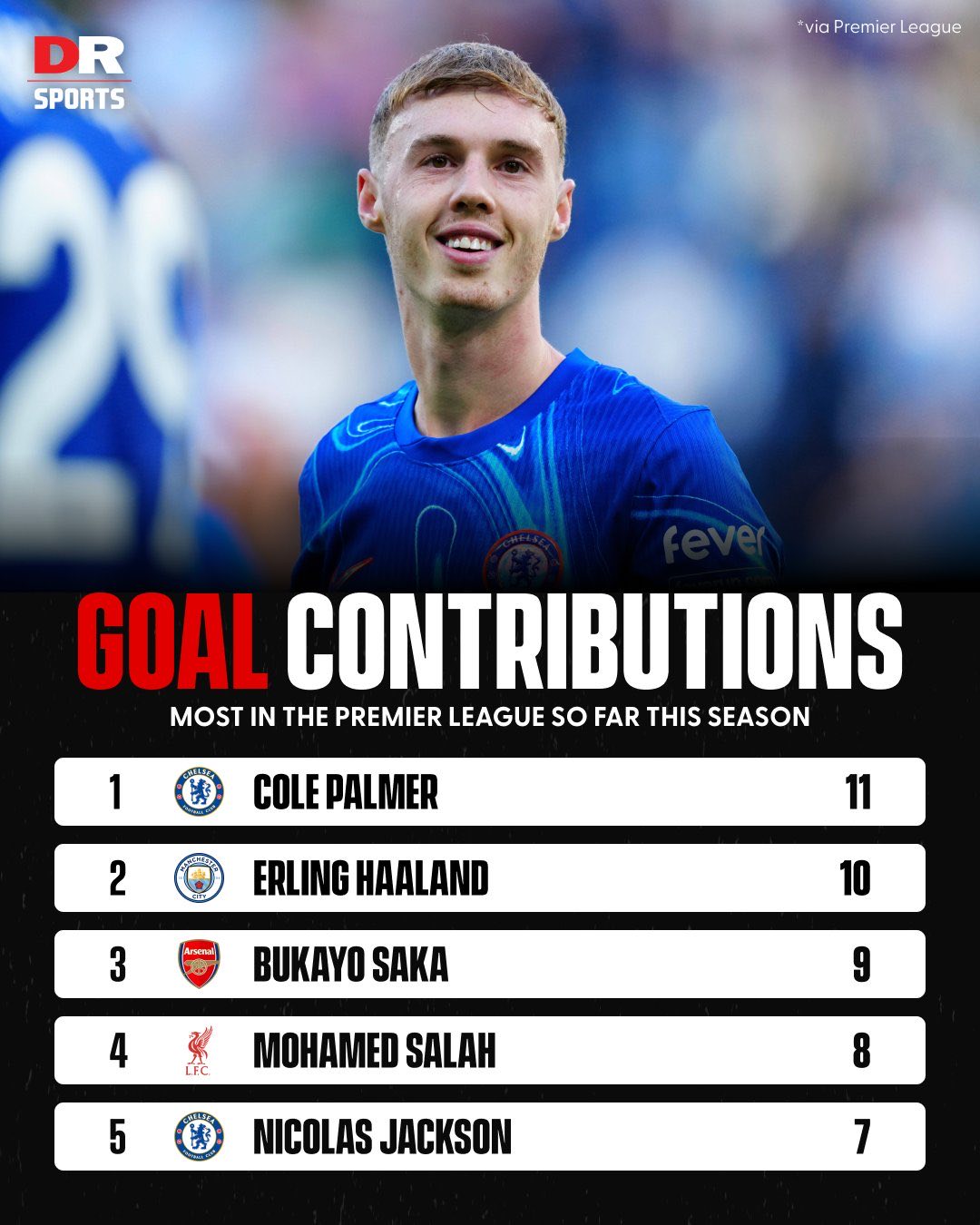 英超目前为止进球贡献排行榜,帕尔默11球领衔!