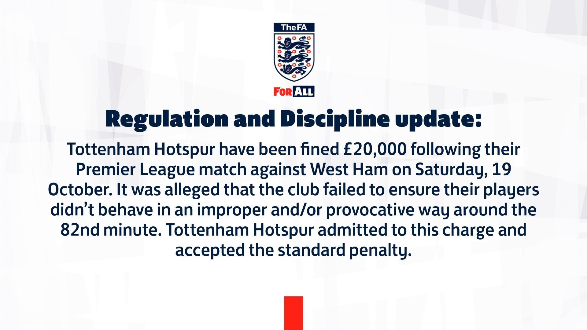 托特纳姆热刺被罚款20000英镑,该俱乐部因在10月19日星期六与西汉姆联的英超比赛中未能确保其球员在比赛第82分钟左右没有不当和/或挑衅行为,托特纳姆热刺承认了这一指控并接受了标准处罚。(公告完)