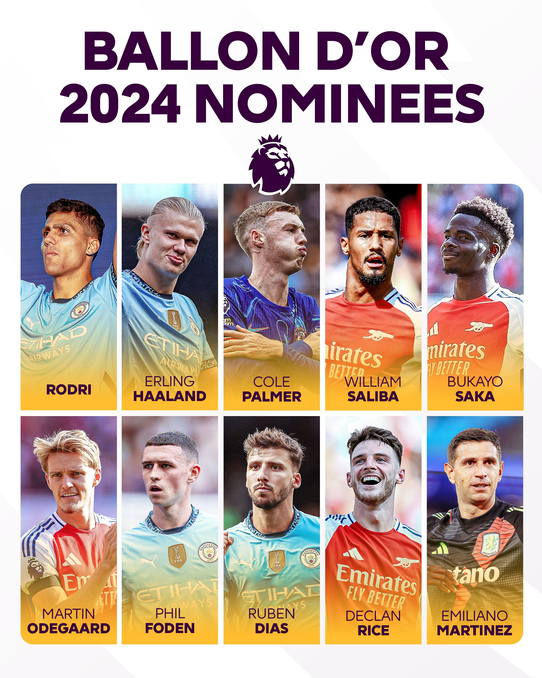 2024金球奖颁奖典礼将于北京时间明天凌晨03:45举行,英超官方在社交媒体上晒出了入选金球奖候选名单的10名英超球员。
