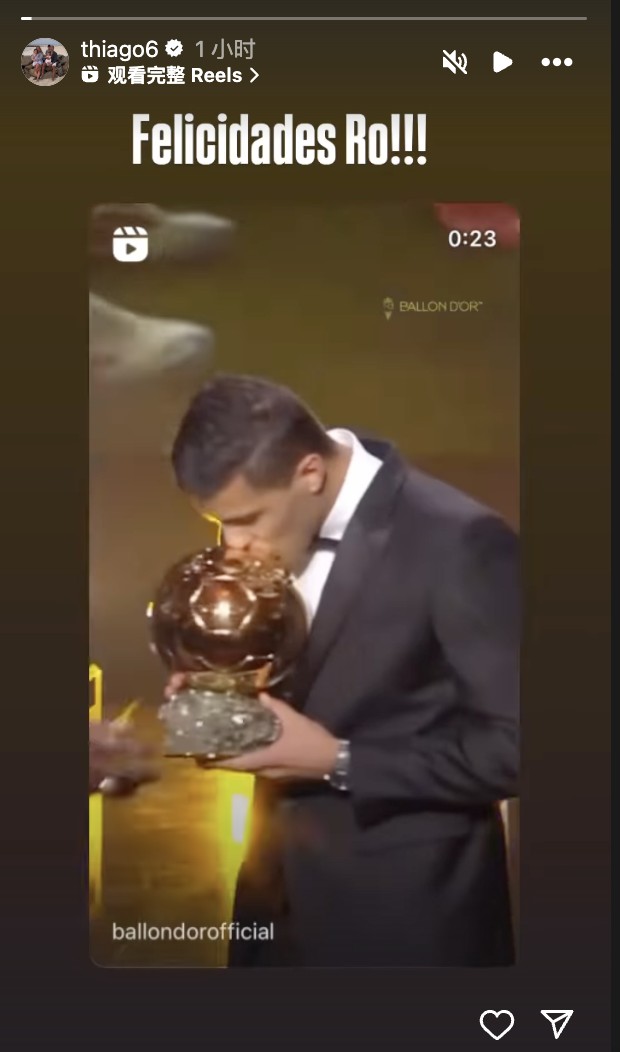 蒂亚戈晒罗德里亲吻金球奖奖杯照:恭喜你,罗德里!