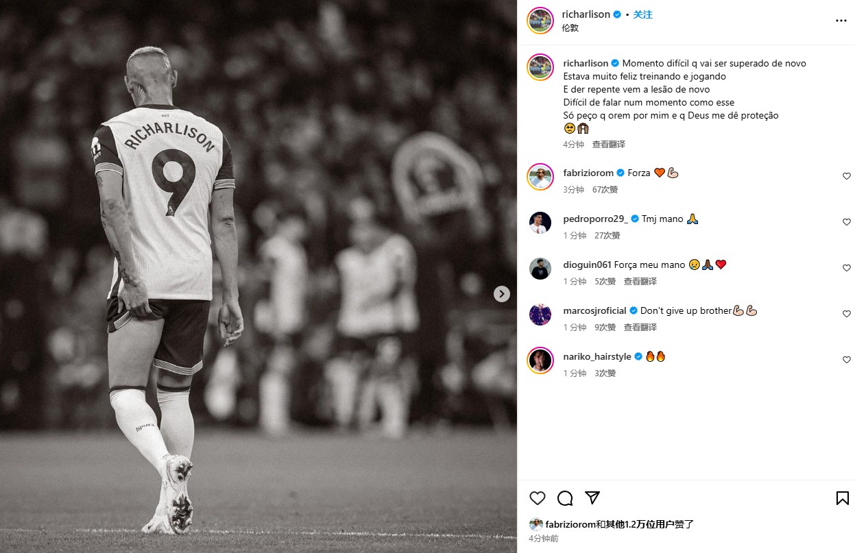在上周末的英超第10轮比赛中,热刺主场4-1击败维拉,其中里沙利松在替补出场之后因伤被换下,就在刚刚,他在社交媒体上发表动态,谈到了自己的情况。