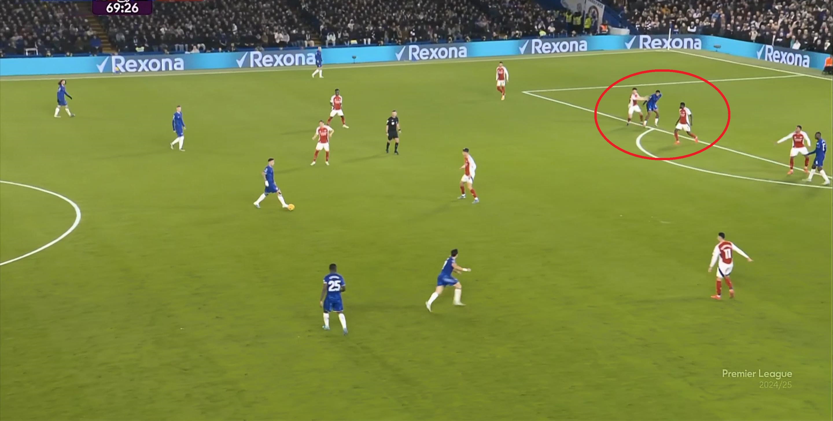 古斯托依然在右侧围绕马杜埃凯活动,帕尔默也因此被送到左半扇,处理球时的别扭感非常清晰。