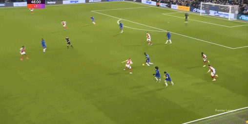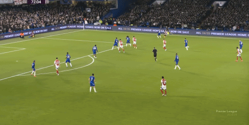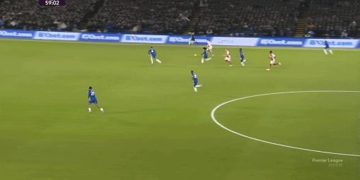 对阵曼联,马雷斯卡至少还在半场把帕尔默弄回了逆足侧,但这场比赛,他没有如此行事。下半场第53分钟的这次进攻,你就可以看到,还是马杜埃凯在右路送上传中,而帕尔默还在左侧远端: