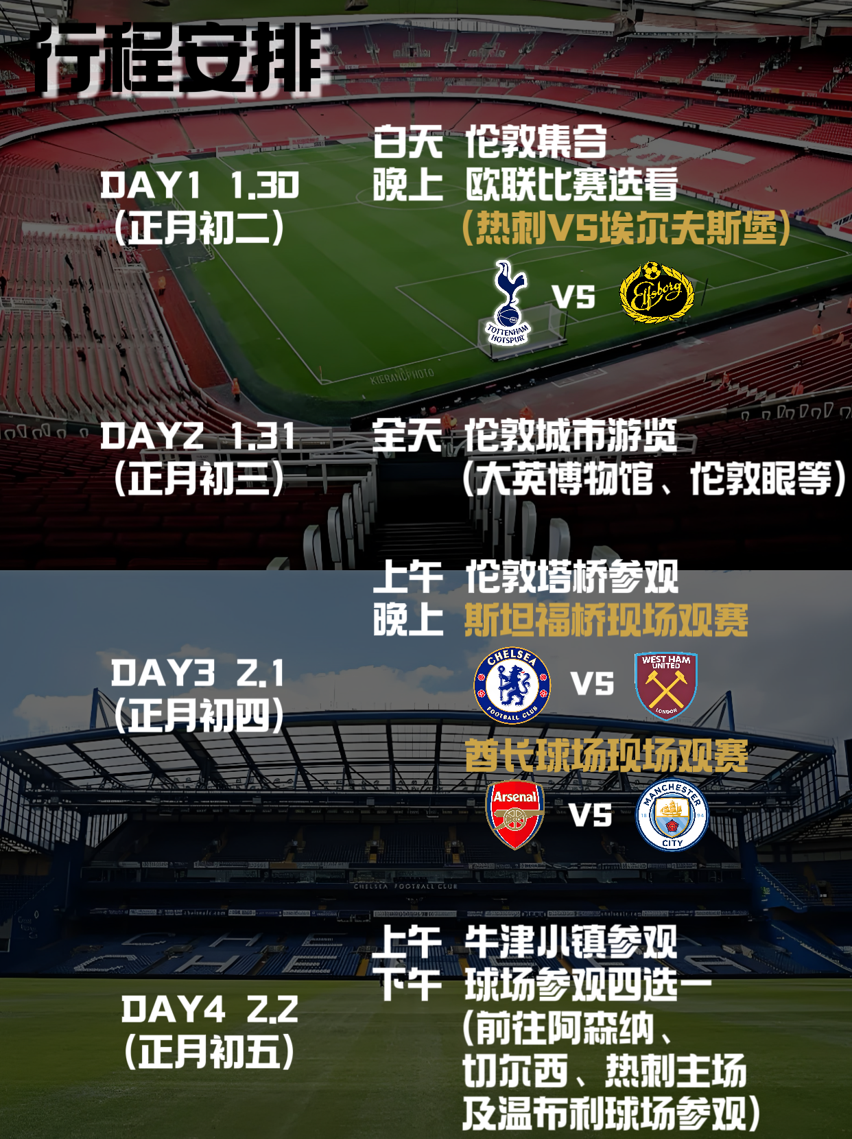 👀阿森纳出现了一面新的壁画——定位球主教练 乔威尔 🔥本周欧冠比赛日告一段落,来看看积分榜! 👉萨卡夺得MVP,阿森纳再取得一场胜利,排在第3位,后面两轮正常发挥就基本可以宣告提前晋级淘汰赛阶段,阿森纳本赛季有望争夺多项冠军吗? 👉曼城0-2尤文,各项赛事10场仅1胜,目前直接出线的形势岌岌可危,最后两轮势必要全部取胜才能保住附加赛名额,周末又要迎来曼市德比,当前的颓势如何逆转呢? 各项赛事赛程密集,想要在春节期间去英国看球吗? 2025是铁杆的十周年,此次朝圣之旅正值春节假期,铁杆特为球迷朋友们推出两套计划!其中圆梦版之旅1.4W起~ 圆梦版:高性价比的舒适体验 朝圣版:豪华高端的畅玩之旅 都是强强对话,期待值拉满! 圆梦版&朝圣版均可选+整装待发确认发团!欢迎您来! 末班车报名时间,快来上车吧!