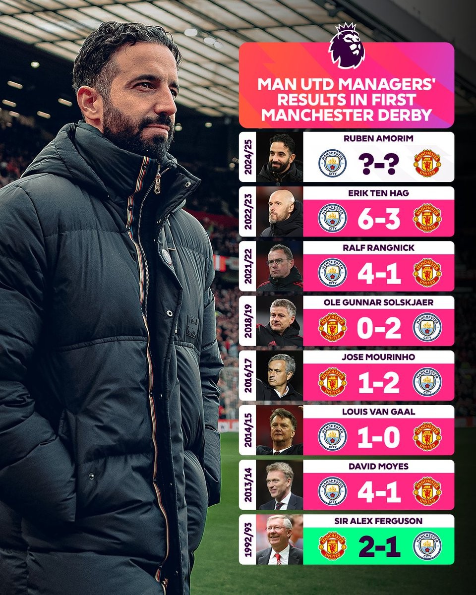 英超第16轮,曼联新帅阿莫林将迎来执教曼联的首场英超曼市德比,据统计,最近6位曼联主帅的首场英超曼市德比均遭遇失利。