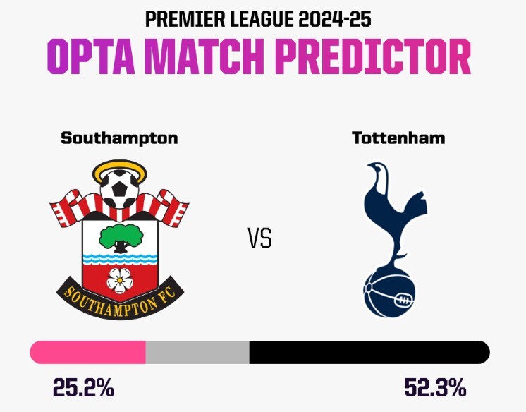 Opta的超级计算机预测热刺赢球概率52.3%,南安普顿获胜可能性25.2%,平局的概率为22.5%。