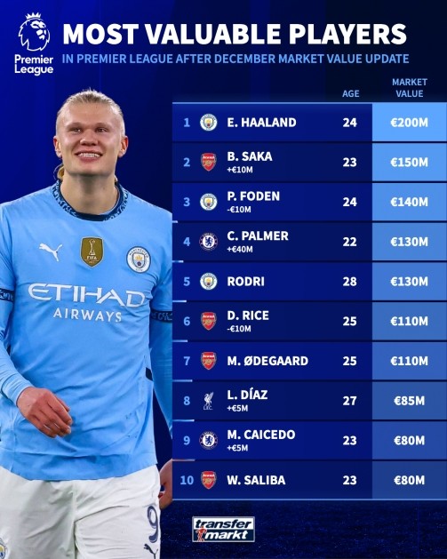 12月16日,德国转会市场网站更新了英超球员身价,哈兰德仍以2亿欧居首,萨卡涨至1.5亿欧,超越福登升至第二。
