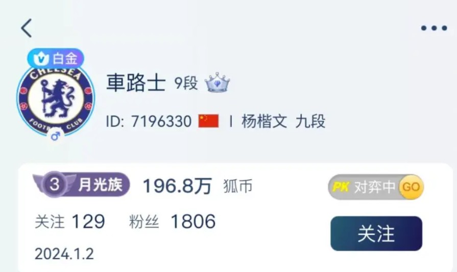 值得一提的是,杨楷文还是一名切尔西球迷,此前他在野狐的头像便是切尔西的队标。