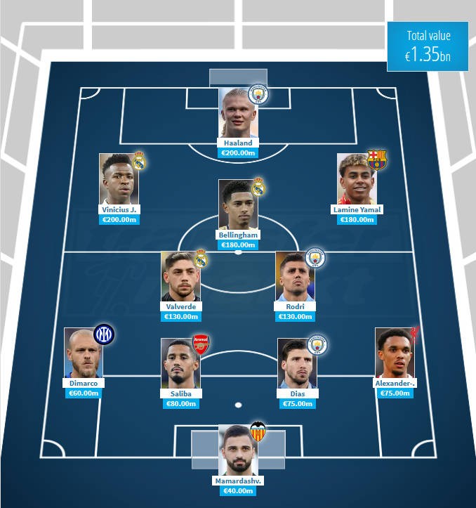 前锋:维尼修斯(2亿欧)、哈兰德(2亿欧)、亚马尔(1.8亿欧)