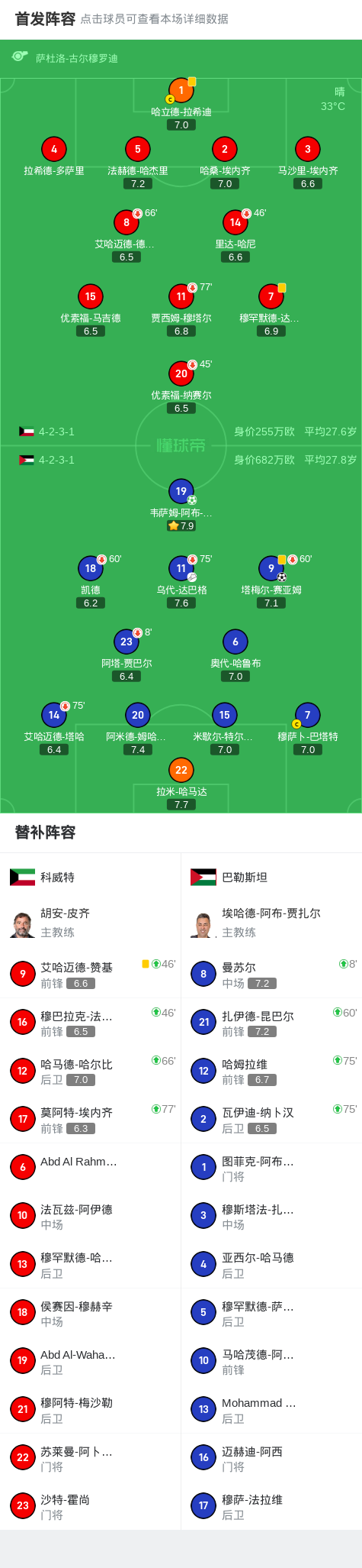 北京时间6月6日世界杯亚洲区预选赛 第三阶段(18强赛) 第9轮,科威特对阵巴勒斯坦。巴勒斯坦塔梅尔-赛亚姆破门,韦萨姆-阿布-阿里破门。最终比分科威特 0 - 2 巴勒斯坦。