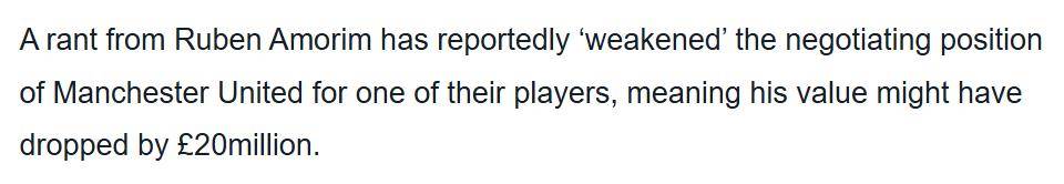 英媒「GIVEMESPORT」报道称,阿莫林的处理方式,弱化了曼联出售加纳乔的谈判立场,因为现在大家都知道两人不和,肯定拼命压价,可能导致加纳乔的价值暴跌2000万英镑!