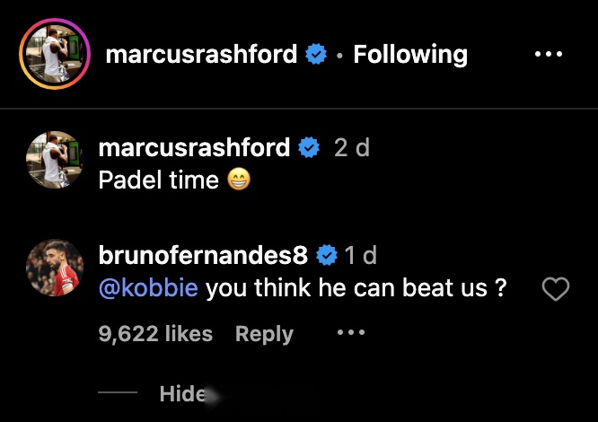 几日前,拉什福德在社交媒体上分享了自己打网球的照片,B费在评论区向梅努提问:你觉得他能打过我们吗?而梅努迅速简单回应了B费的问题:否。
