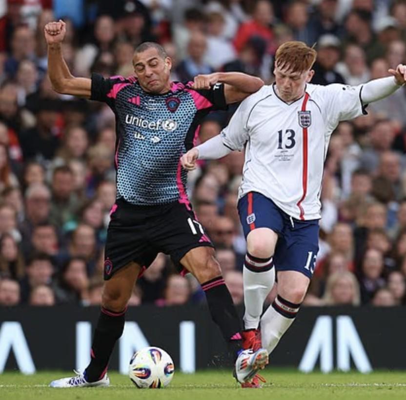 这位23岁的网红代表英格兰出战在老特拉福德举行的对阵世界明星队的第14届慈善赛事。比赛中有鲁尼、里瓦尔多和特雷泽盖等足坛传奇,但却是这位23岁的网红在上半场抢尽了风头。