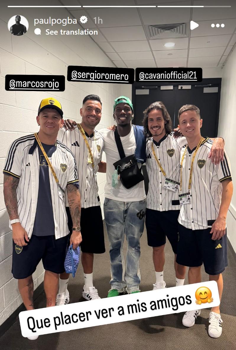 比赛结束之后,博格巴在自己的社交媒体上晒出了和四位前曼联队友的合照,并且配文:“见到老朋友们真开心”,卡瓦尼、罗梅罗、埃雷拉和罗霍都效力于博卡青年。