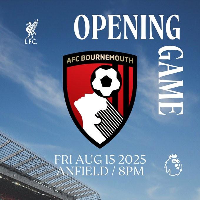 根据公告,2025-26赛季的英超揭幕战将是卫冕冠军利物浦坐镇主场安菲尔德迎战伯恩茅斯,本场比赛将于8月16日03:00开始。