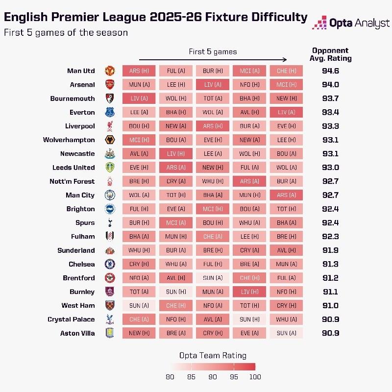 北京时间6月18日,英超官方更新了新赛季的赛程,在新赛季赛程出炉后,Opta对各队前五轮赛程的难易程度进行了排名。