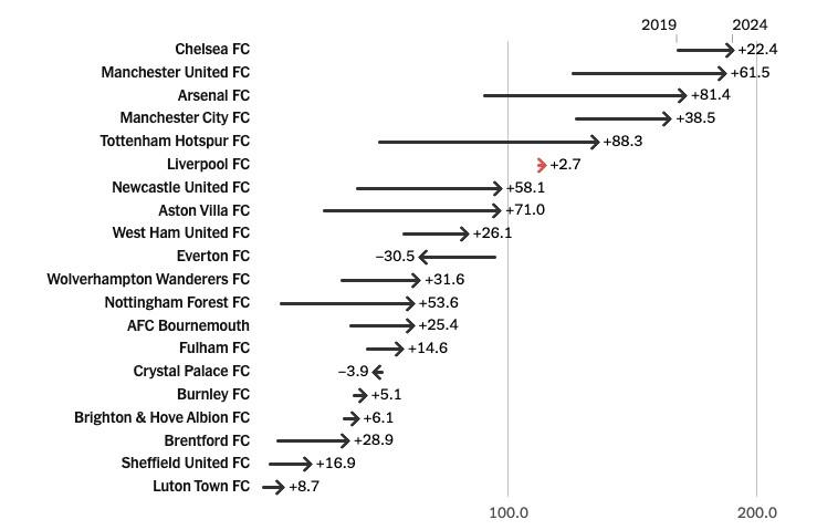 人们对利物浦的印象是正确的,他们的转会支出总体上要落后于国内的竞争对手。截至2023-24赛季,利物浦组建球队的成本为7.494亿英镑,包括转会费和经纪人佣金,排名全球第7。但这一数字远远落后于切尔西(14亿镑)、曼城(11亿镑)、曼联(9.439亿镑)和阿森纳(8.824亿镑)。