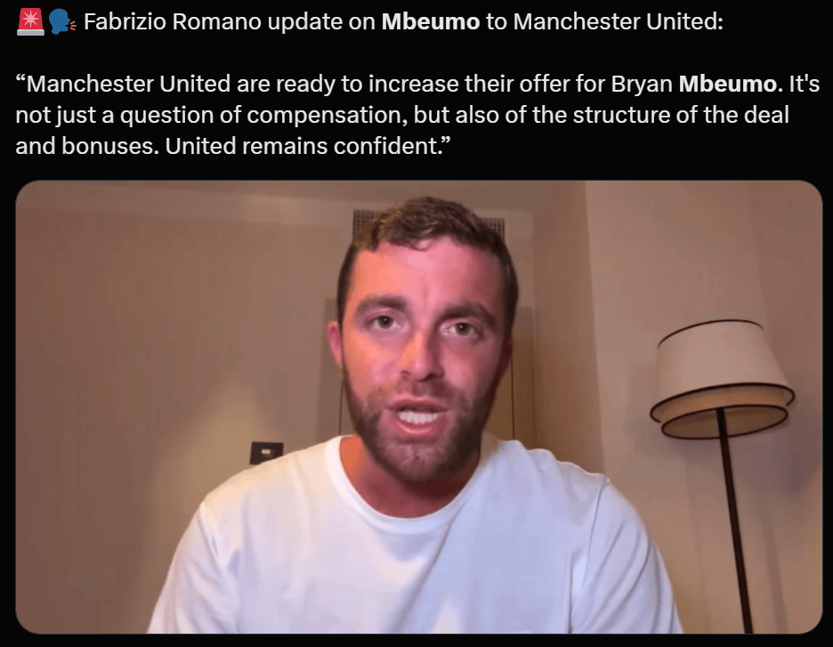 按照罗马诺的说法,曼联打算妥协,再次提高自己对姆贝莫的报价:「曼联准备增加对姆贝莫的报价,这不仅仅是转会费的问题,也是交易结构和浮动奖金的问题。曼联仍然充满信心。」