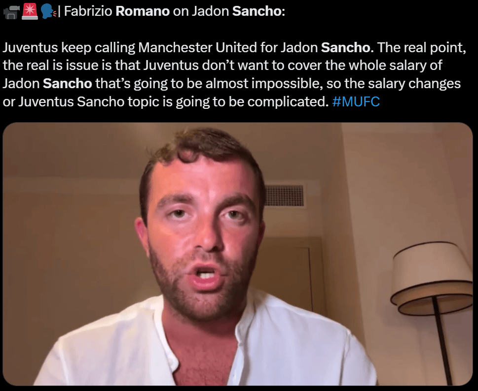 虽然有意媒称曼联与尤文已经就桑乔的转会达成一致,但这不代表转会即将完成,因为这笔交易无论以什么方式进行,是2500万欧元转会费,或是交换路易斯,最大的障碍都是桑乔的工资。他同意降薪,但幅度还不够。意大利转会专家法布里济奥·罗马诺解释道:「关于桑乔的转会,尤文图斯一直在联系曼联。真正的问题在于,尤文无法承担全部薪水,几乎不可能做到这一点,因此薪资问题将会令桑乔转会的话题变得复杂。」