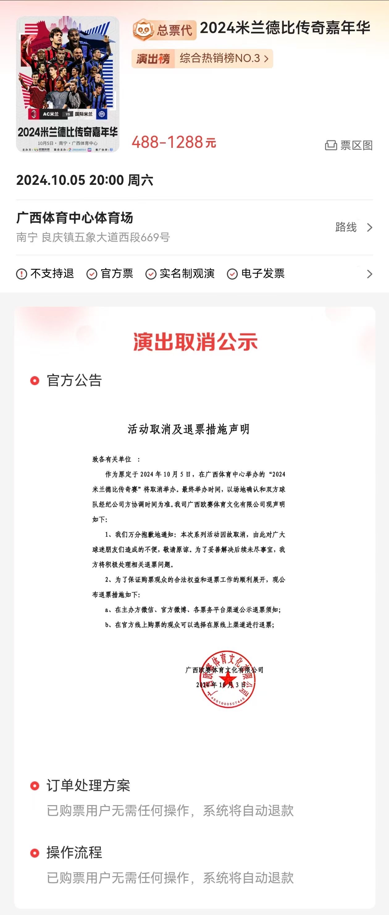 离离原上谱[裂开] 米兰元老德比,本来挺好的一事儿。很早之前俱乐部就邀请我去,还争取了给球迷赠票。因为周末要上班,加上这么长的旅途到南宁,一开始我也有些犹豫。但说实话很长时间国内都没有高质量的商业赛了,所以后来还是特意请了一天假,今天夜里一下欧联直播就飞,周日一大早再飞回来解说…结果刚刚一觉醒来,告诉我比赛取消了?!我第一时间先联系赠票球迷问其是否出票,结果他告诉我昨晚给他出票,他和朋友都在高铁上了… 传奇赛元老赛,永远寄托着的都是球迷的情怀和深厚的感情,最终却演变成离谱的闹剧。卡卡已经在南宁,很多球迷都早早安排好了出行计划…但,收获到的是当头一棒。不断有朋友发消息问我取消原因,我如实回答:不知道。因为我也和所有球迷一样极度失望,边退票边生气…