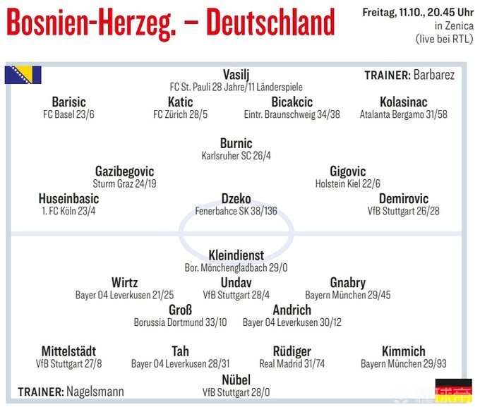 北京时间10月12日凌晨2:45,德国队将迎来欧国联A级联赛第三轮客场对阵波黑的比赛,赛前,《踢球者》预测了双方的首发阵容。