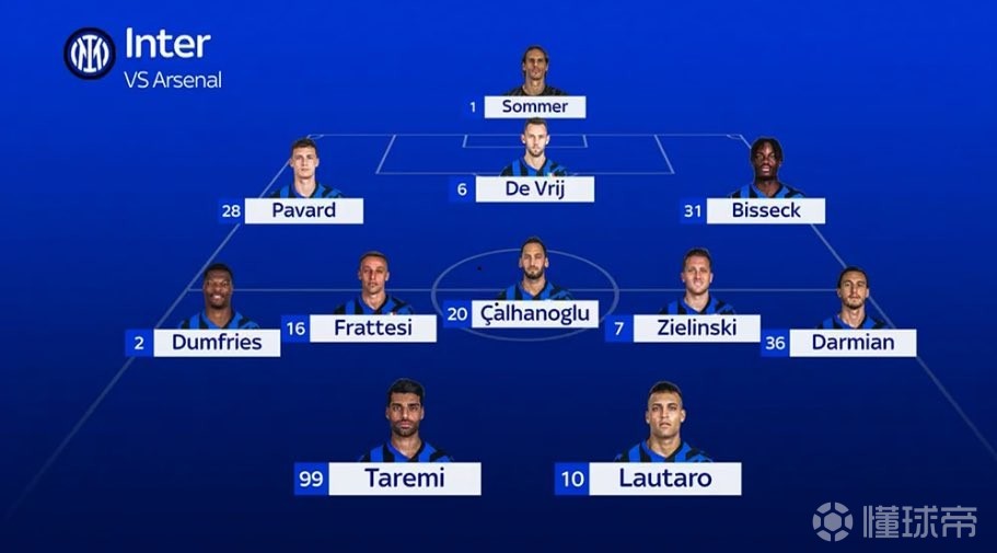 索默;帕瓦尔、德弗赖、比塞克;邓弗里斯、弗拉泰西、恰尔汗奥卢、泽林斯基、达米安;塔雷米、劳塔罗