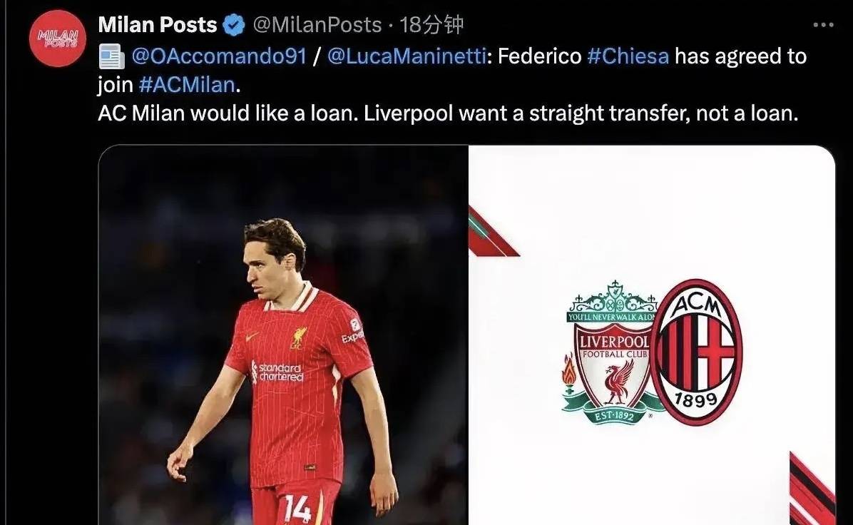 达成一致!米兰与基耶萨在个人条款层面达成一致,米兰正在与利物浦沟通转会形式,米兰提出的交易方案为租借加选择性购买,这个报价一看就知道是米兰的报价。