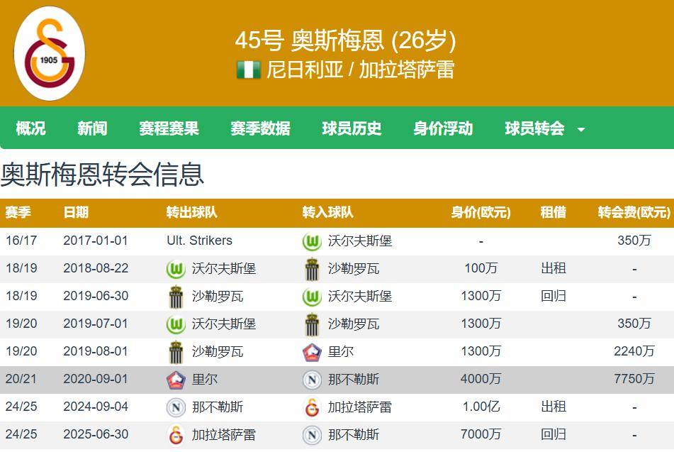 奥斯梅恩在里尔成名,球员于2020年夏窗以7750万欧元的转会费从里尔转投那不勒斯,随队夺得过意甲冠军,个人荣膺过意甲金靴,但早早与那不勒斯闹掰了,本赛季外租至加拉塔萨雷踢球,因为性格的原因,也无法登陆球员英超。