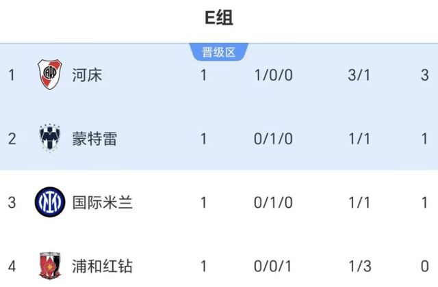 截至目前,E组首轮比赛已经踢完,河床队目前以3分排名第一,这支阿根廷豪门,也占据了出线主动权。在这个小组,蒙特雷无疑已经成为大黑马,他们首战逼平强大的国米,证明了自己的实力,接下来对阵河床和浦和红钻,他们如果能延续这个状态,随时可能小组出线。