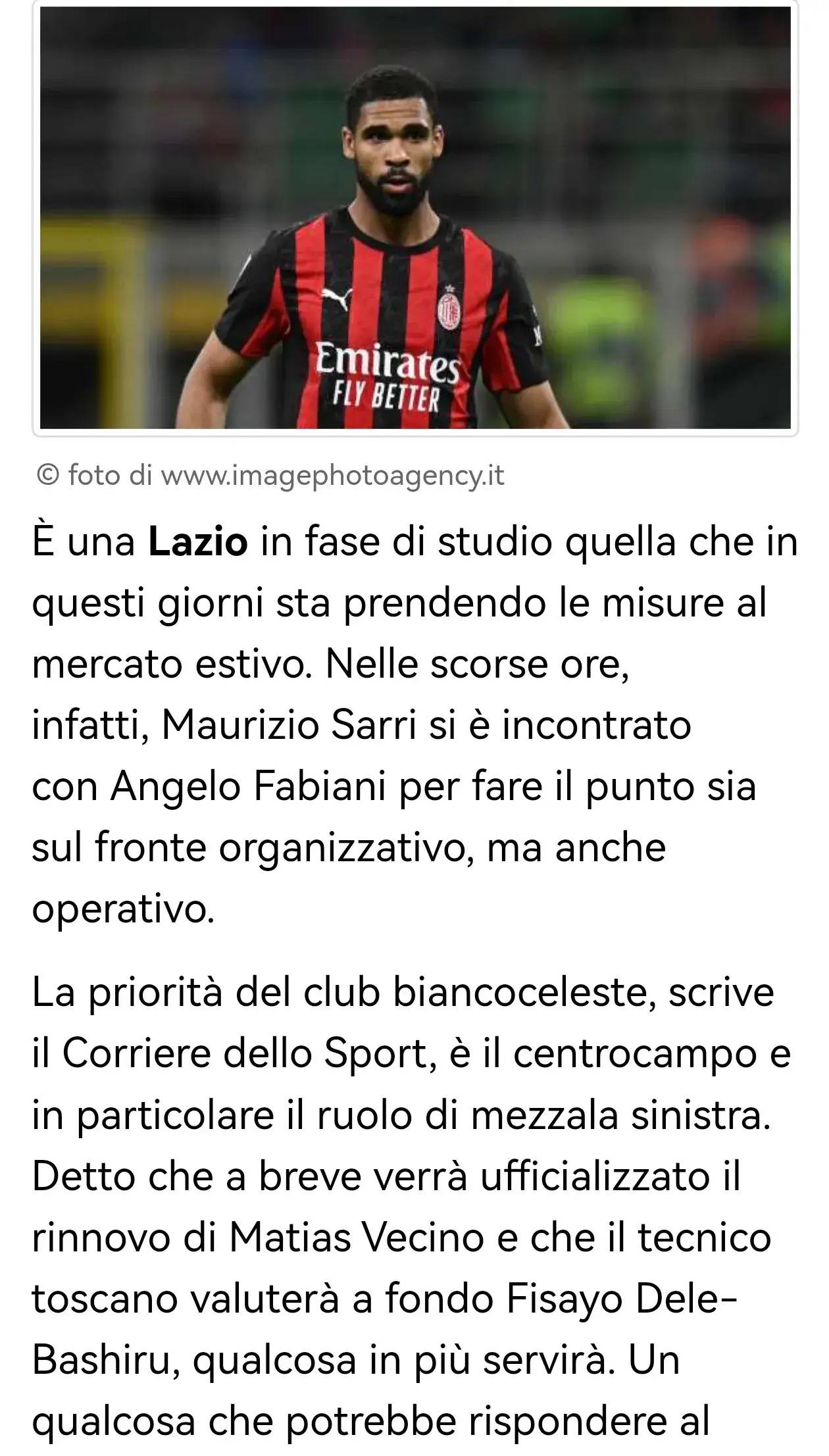 拉齐奥正处于夏季转会窗的规划阶段。事实上,毛里齐奥·萨里近日已与安杰洛·法比亚尼会面,不仅讨论了球队组织架构,也涉及引援操作。