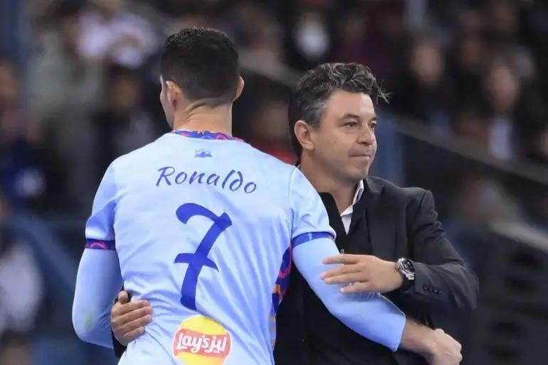 河床主帅曾在2023年执教利雅得全明星队对阵巴黎圣日耳曼的友谊赛中短暂与C罗共事。