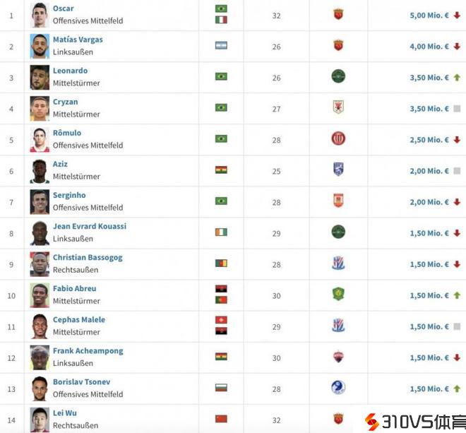 中超球员身价排名:奥斯卡500万欧居首,巴尔加斯400万欧次席