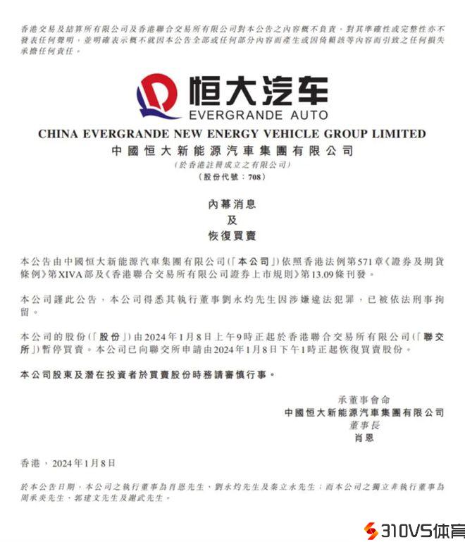 恒大汽车执行董事刘永灼被刑拘