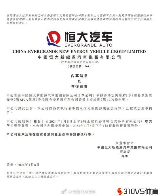 1月8日上午收盘前,恒大汽车针对上述事项停牌。1月8日13时,恒大汽车收盘出现大幅下跌,盘中一度跌超14%。截至收盘,恒大汽车跌6.02%,报0.390港元/股,市值42.29亿港元。