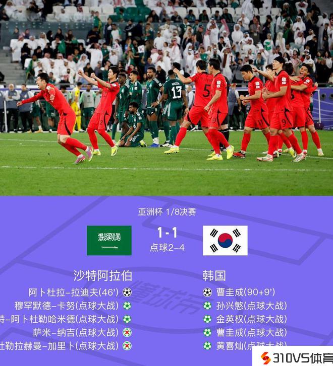北京时间1月31日0点,亚洲杯1/8决赛一场焦点大战在沙特阿拉伯与韩国队之间展开。上半场,谢赫里、拉贾米头球延续中梁。双方半场互交白卷。易地再战,风云突变!拉迪夫替补闪电破门,韩国替补退场的曹圭成补时绝平。加时赛中,门将卡萨尔有如神助。进入点球大战,赵贤祐两度扑点力挽狂澜,黄喜灿打进制胜点球。最终韩国点球大战4-2,总比分5-3淘汰沙特队,晋级八强,他们在1/4决赛将对阵澳大利亚。