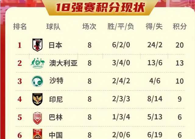 国足这场比赛是一场十足的“生死战”,在 2026 年世界杯亚洲区预选赛 18 强赛 C 组中,国足以8战 2 胜 6 负积 6 分的成绩位居小组垫底。这个小组形势为:日本队以 6 胜 2平积 20分的成绩排名小组榜首,已提前锁定直接晋级世界杯的名额;澳大利亚队积 13分暂列第二;沙特队积 10分排名第三。印尼队9分排名第四、巴林队和中国队同积 6 分,但中国队因净胜球劣势处于小组最后一名。