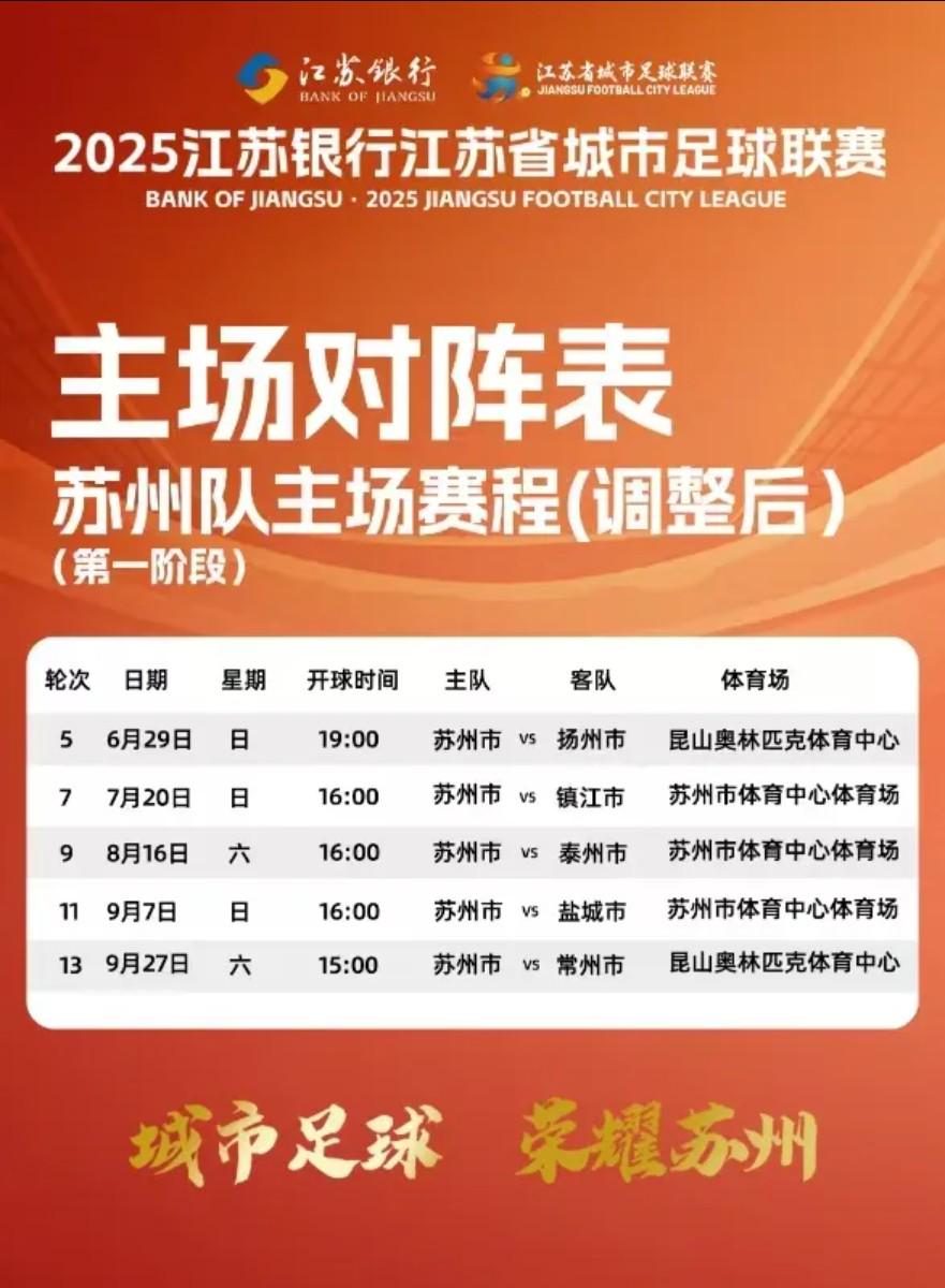 苏州市体育局消息,苏州队将“苏超”第5轮与第13轮主场更改至昆山奥体中心,还有多场比赛在苏州市体育中心体育场举行。