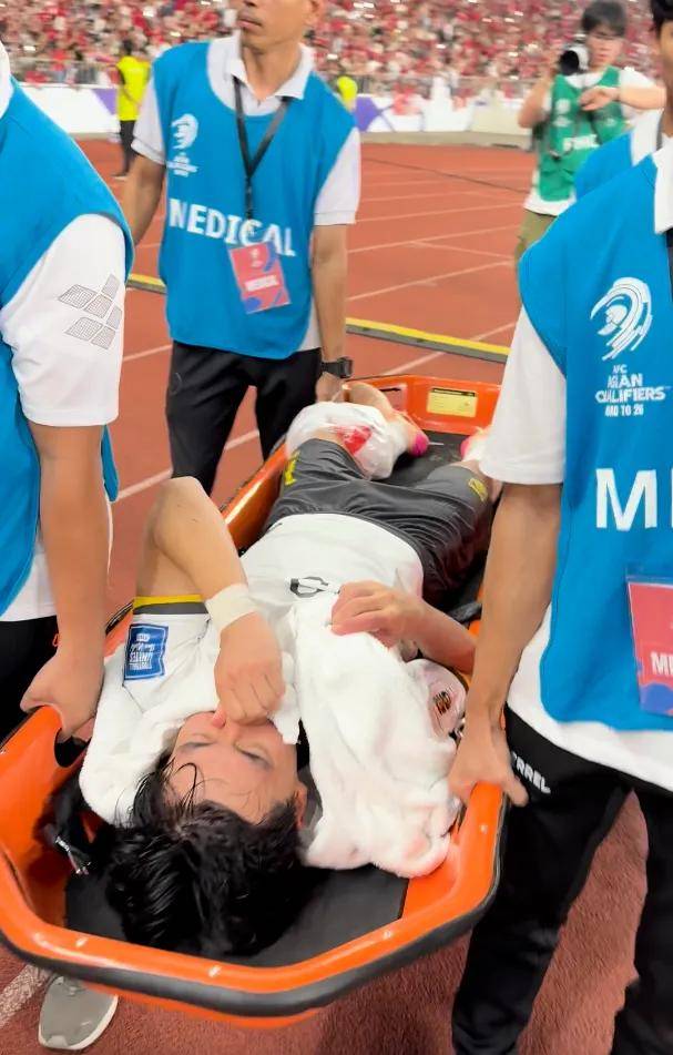 而在比赛最后时刻,印尼队开球准备进攻时,胡荷韬又拖着自己的伤腿一瘸一拐地回到场上准备参与防守。而在裁判吹响终场哨后,胡荷韬马上瘫倒在地。据博主“徐总不会踢球”透露,胡荷韬赛后第一时间被抬上了救护车。而在现场视频来看,胡荷韬的左腿膝盖处绑上了冰袋,他本人也显得非常沮丧。